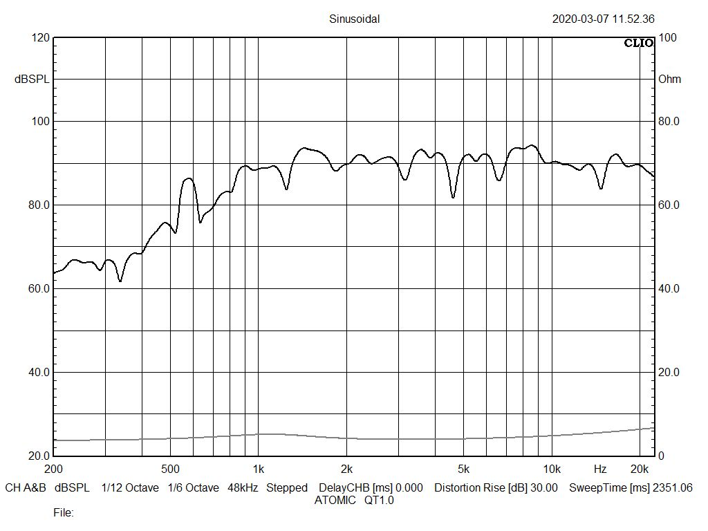 上面提到了,Atomic、Gypsy Sound吉普赛之声等品牌的官方频响范围数据,都是按响度正负不超过3dB的标准来选取,那么如果这些品牌的喇叭,也按-20dB做响度波动标准,那么频响范围数据又会变得多“好看”呢?下面是用CLIO对ATOMIC QT1.0高音单元的频响实测,大家看了后相信也就一目了然。